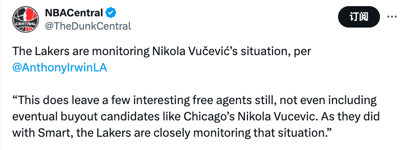 Anthony Irwin表示:“湖人在留意一些自由球员,甚至还没算上像芝加哥公牛的尼古拉-武切维奇这类最终可能被买断的球员。就像关注斯马特的情况一样,湖人正在密切关注武切维奇的动态。”