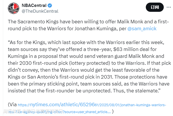 2025-08-01 23:10北京时间8月1日,根据NBA记者萨姆-阿米克报道,萨克拉门托国王队愿意提供马利克-蒙克和一个首轮选秀权,从勇士队交易得到乔纳森-库明加。