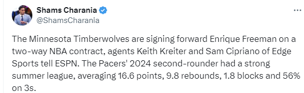 该记者写道:“明尼苏达森林狼队将与前锋恩里克-弗里曼签下一份NBA双向合同,来自Edge Sports的经纪人基思-克赖特和山姆-西普里亚诺向ESPN透露了这一消息。这位步行者队2024年的次轮秀在夏季联赛中表现出色,场均得到16.6分、9.8个篮板、1.8次封盖,三分球命中率为56%。”
