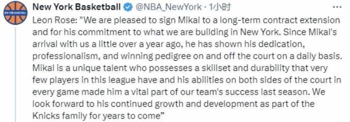 罗斯表示:“我们很高兴能与米卡尔签下一份长期续约合同,也感谢他对我们在纽约所构建的一切的投入。自从米卡尔一年多前加入我们以来,他每天都在场上场下展现出自己的敬业精神、职业素养和冠军血统。米卡尔是一位独特的天才球员,他拥有联盟中极少数球员才具备的技术能力和耐战性,他在每一场比赛中攻防两端的表现,都让他成为了我们球队上赛季成功的关键一员。我们期待着未来几年里,作为尼克斯大家庭的一员,他能持续成长和进步。”