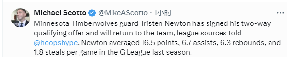 该记者写道:“据联盟消息人士告知,明尼苏达森林狼队后卫特里斯滕-牛顿已签下双向资质报价合同,将回归球队。上赛季在发展联盟中,牛顿场均能得到16.5分、6.7次助攻、6.3个篮板和1.8次抢断。”