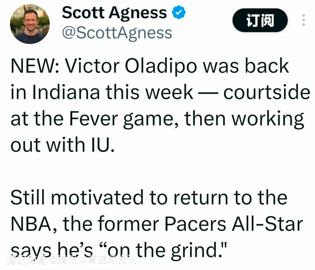 在与步行者队记Scott Agness的互动中,奥拉迪波表示自己出现的原因是来看比赛,享受当下,他也坦承自己正在刻苦训练,渴望继续自己的职业生涯。