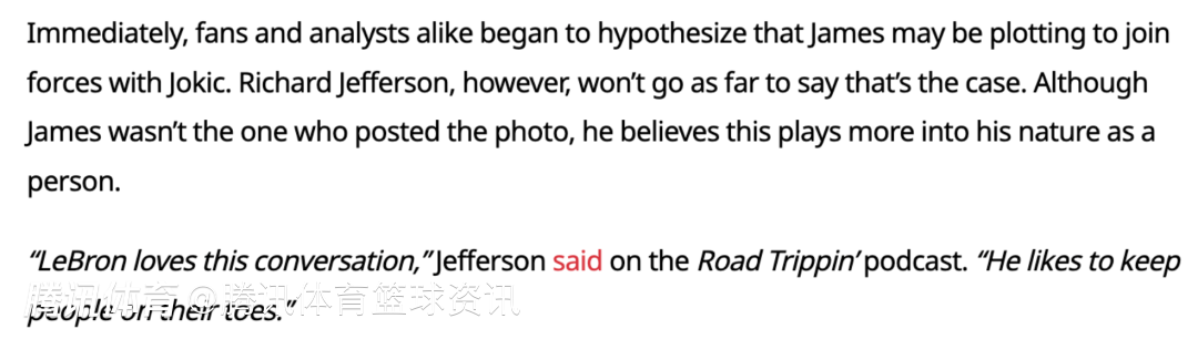 理查德-杰弗森谈詹姆斯与约基奇经纪人合照:他就想吊足大家胃口