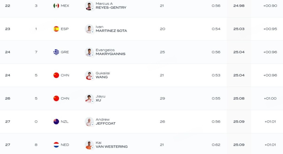 总成绩方面,王谷开来和徐嘉余分别排名第24和第25位,均未能进入到半决赛。