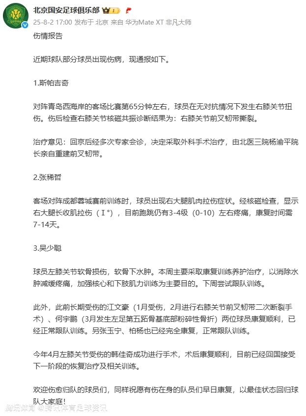 公告显示,外援中卫斯帕吉奇被确诊为右膝前交叉韧带撕裂,预计将接受前叉韧带重建手术,赛季前景堪忧。斯帕吉奇本赛季是国安后防线的主力之一,此次重伤无疑将对球队防线造成巨大影响。