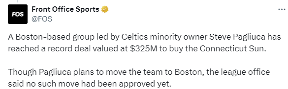 2025-08-03 07:30北京时间8月3日,根据Front Office Sports报道,由凯尔特人队小股东史蒂夫-帕柳卡牵头的波士顿财团已达成一项价值3.25亿美元的创纪录交易,成功收购WNBA的康涅狄格太阳队,并计划在2027年前将球队迁至波士顿。