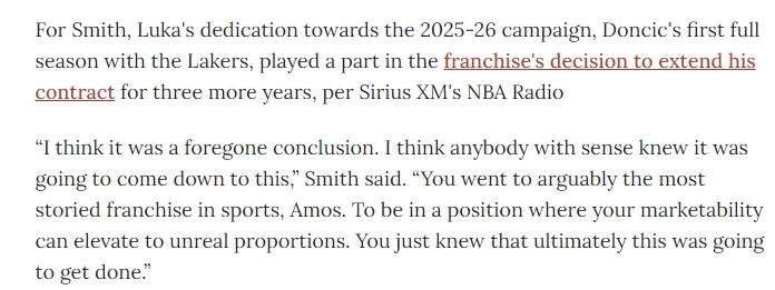 A-史密斯表示:“我认为这是意料之中的事,任何有头脑的人都知道事情最终会是这个结果,要知道,东契奇加入的可以说是体育界最具传奇色彩的球队。在这样的平台上,他的商业价值能提升到不可思议的程度。所以你完全能预料到,续约这件事最终肯定能成。”
