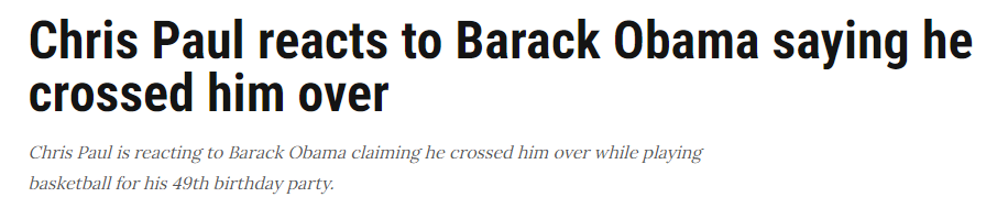 “49岁生日时,我组织了一场小型NBA全明星赛,勒布朗-詹姆斯来了,还有韦德、德里克-罗斯和克里斯-保罗。我们每队有3名职业球员和2名业余球员。兄弟,我投进了制胜球。我投进了一个三分,还把克里斯晃过了。”奥巴马在面对一群学生演讲时说道。在场的人都笑了起来,这让奥巴马回应道:“你们好像觉得我在撒谎。克里斯-保罗是我的朋友。要我现在给他打个电话求证吗?”孩子们还在继续笑着。而保罗本人则在网上回应道:“没有录像,就等于没发生过!”