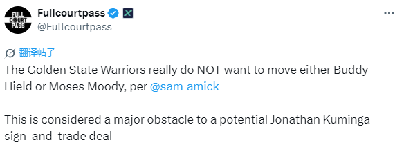 2025-08-05 05:50北京时间8月5日,据记者Sam Amick报道,勇士队确实非常不愿意交易巴迪-希尔德或摩西-穆迪中的任何一人,这被视为潜在的库明加先签后换交易的一个主要障碍。