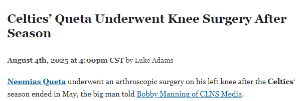 2025-08-05 05:50北京时间8月5日,凯尔特人球员凯塔在接受采访时透露,在凯尔特人队5月赛季结束后,他的左膝接受了关节镜手术。
