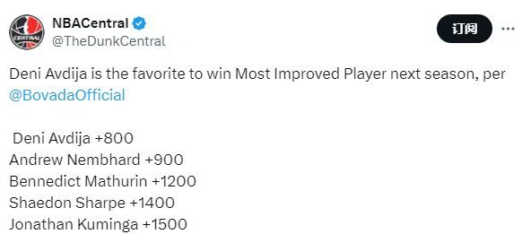 2025-08-05 08:30北京时间8月5日,Bovada公布下赛季进步最快球员奖的赔率,杨瀚森的开拓者队友阿弗迪亚领跑该榜单,来自步行者的两位球员內姆布哈德和马瑟林紧随其后。