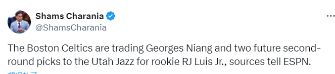 凯尔特人队将把乔治斯-尼昂和两个未来的次轮选秀权交易至爵士队,换来新秀RJ-路易斯。