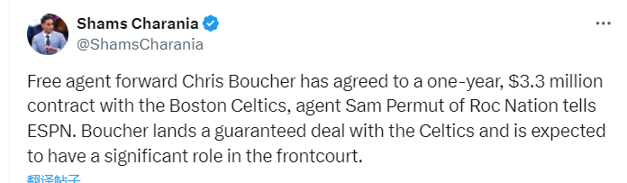 Shams还报道称,绿军一年330万的老将底薪合同签下了自由球员克里斯-布切尔,由他填补尼昂在常规阵容中的位置。