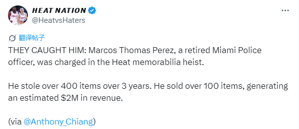2025-08-06 06:30北京时间8月6日,据热火队记Anthony Chiang报道,美国司法部发布新闻稿显示,迈阿密市警察局25年退休人员马科斯-托马斯-佩雷斯被指控窃取价值数百万美元的迈阿密热火队比赛穿过的球衣及其他贵重纪念品,并将其出售给在线中间商。