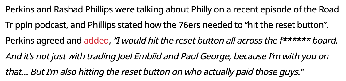 帕金斯:76人不仅要交易掉乔治和恩比德 还得把管理层给清理掉