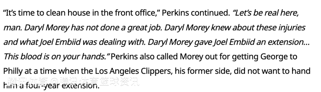 帕金斯表示:“是时候清理管理层了,讲真的,莫雷干得可不怎么样,他知道这些伤病情况,知道恩比德在承受什么,还给他续约,这烂摊子有你的责任。另外在快船队不愿给乔治4年续约合同时,你还把他给弄到了费城。”