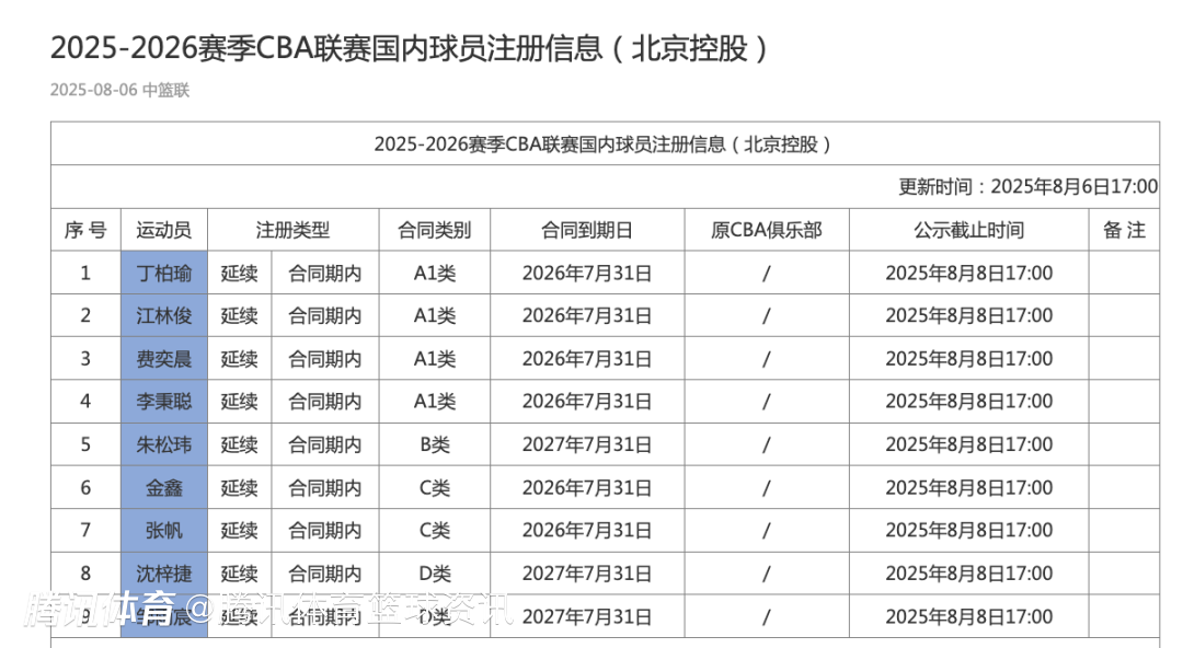 2025-08-06 18:20北京时间8月6日,CBA官网公布了25-26赛季北控男篮国内球员的注册信息,球队先行注册9名球员,近期陷入交易传闻的陈国豪未在列,北控也是休赛期第一个提交下赛季国内注册球员的的球队。