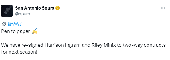 马刺官方:球队与哈里森-英格拉姆及米尼克斯达成双向合同续约