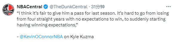 奥康纳表示:“我认为,上个赛季的表现给库兹马一次机会是合情合理的。毕竟,从连续四年输球、毫无赢球预期的状态,突然转变为背负赢球期望,这并非易事。”