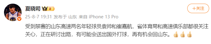 夏晓司在个人微博上写道:“受到禁赛的山东高速两名年轻球员袁帅和崔嘉航,省体育局和高速俱乐部都很关注关心,正在研讨出路,有可能会送出国外打球,再有机会回山东。”