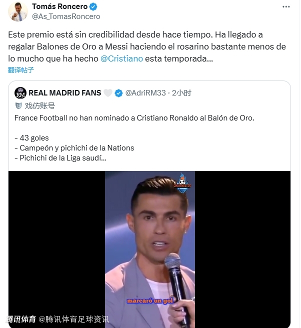 阿斯报主编龙赛罗转发该言论并表示支持:“这个奖项已经长时间失去公信力了。他们之前把金球奖给了梅西,而梅西在当时的表现远不如本赛季的C罗出色。”