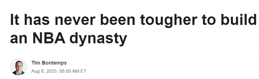 2025-08-08 21:40北京时间8月8日,ESPN长文探讨NBA近年的群雄并起,感慨构建王朝从未如此艰难。