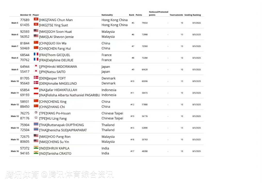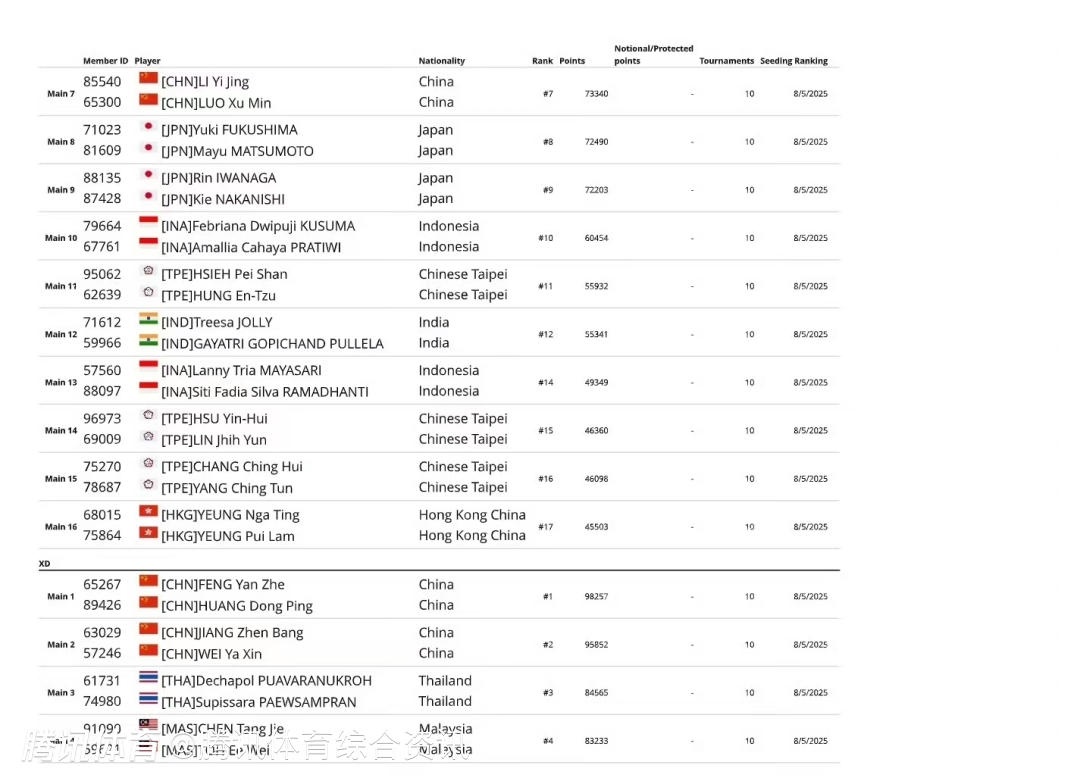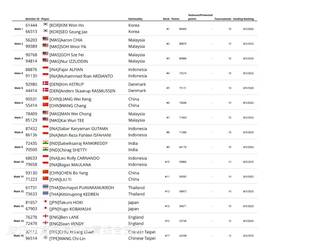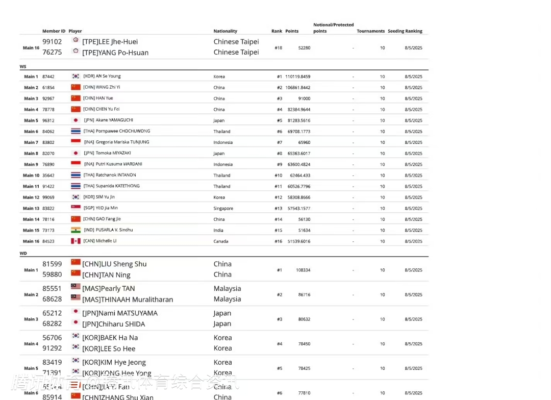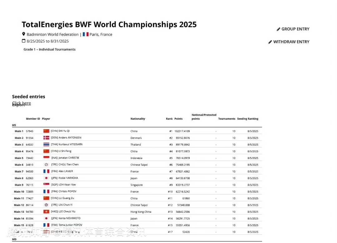 2025-08-09 07:10北京时间8月9日,世界羽联公布2025年羽毛球世锦赛五个单项种子选手名单。石宇奇领衔,中国选手占据男单、女双、混双三个单项第一。