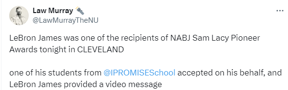 2025-08-09 08:40北京时间8月9日,根据NBA记者Law Murray报道,湖人队球员詹姆斯是今晚在克利夫兰举行的全美黑人记者协会(NABJ)山姆-莱西先锋奖的获奖者之一。