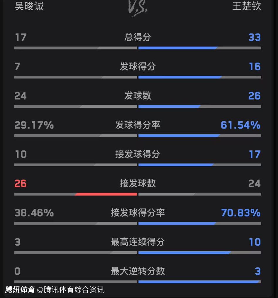 双方技术统计如下(王楚钦在前):总得分33-17、发球得分16-7、发球得分率61.54%-29.17%、接发球得分17-10。