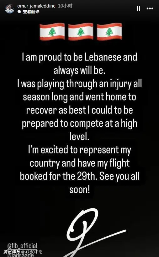 贾马勒丁连发两条动态:第一条强调“身为黎巴嫩人永远自豪”,解释自己“整个赛季带伤作战需回国康复”,并高调宣布“已订7月29日回国机票,期待代表国家队出战”.