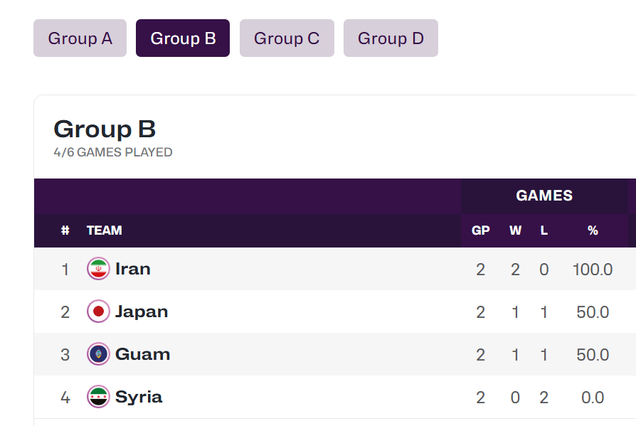 B组第三大概率在日本队和关岛队之间产生,两支球队目前也都是1胜1负,小组赛最后一战同样直接交锋。从小组赛表现来看,日本队依然占据一些优势。