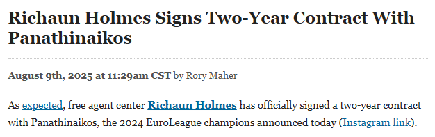 成为完全自由球员后,霍姆斯吸引了多家欧洲篮球联赛俱乐部的关注,包括土耳其的费内巴切队。上周末有报道称,他在考虑帕纳辛奈科斯的报价的同时,也在等待是否能收到一份有保障的NBA合同。