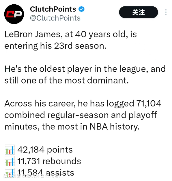 Clutch Points总结称,大多数球员在征战十年后便会状态下滑。詹姆斯已经熬过了两个十年,历经四个时代,战胜了整整一代的对手。这是一种永不褪色的统治力。