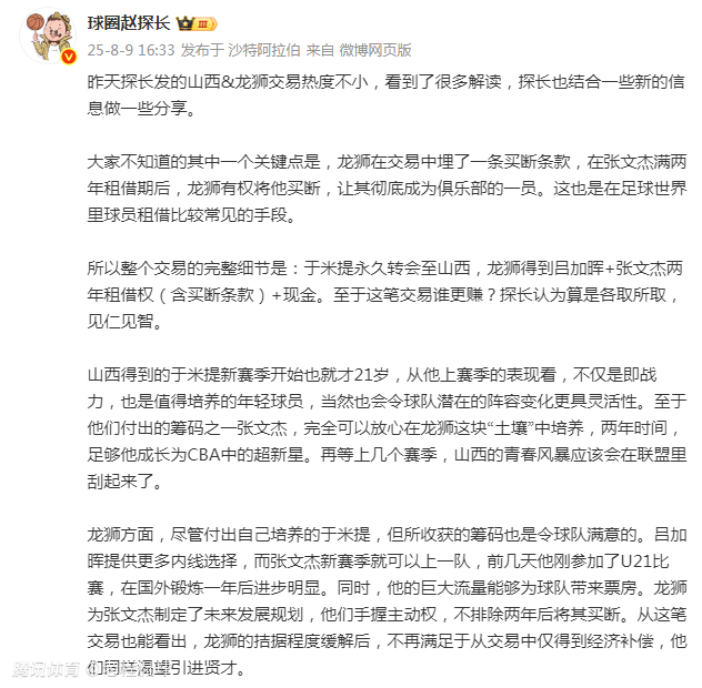 2025-08-10 14:50媒体人赵探长透露,山西男篮和广州男篮的交易中,广州队得到的不只是现金和新人张文杰的两年租借权,还有一条买断条款。