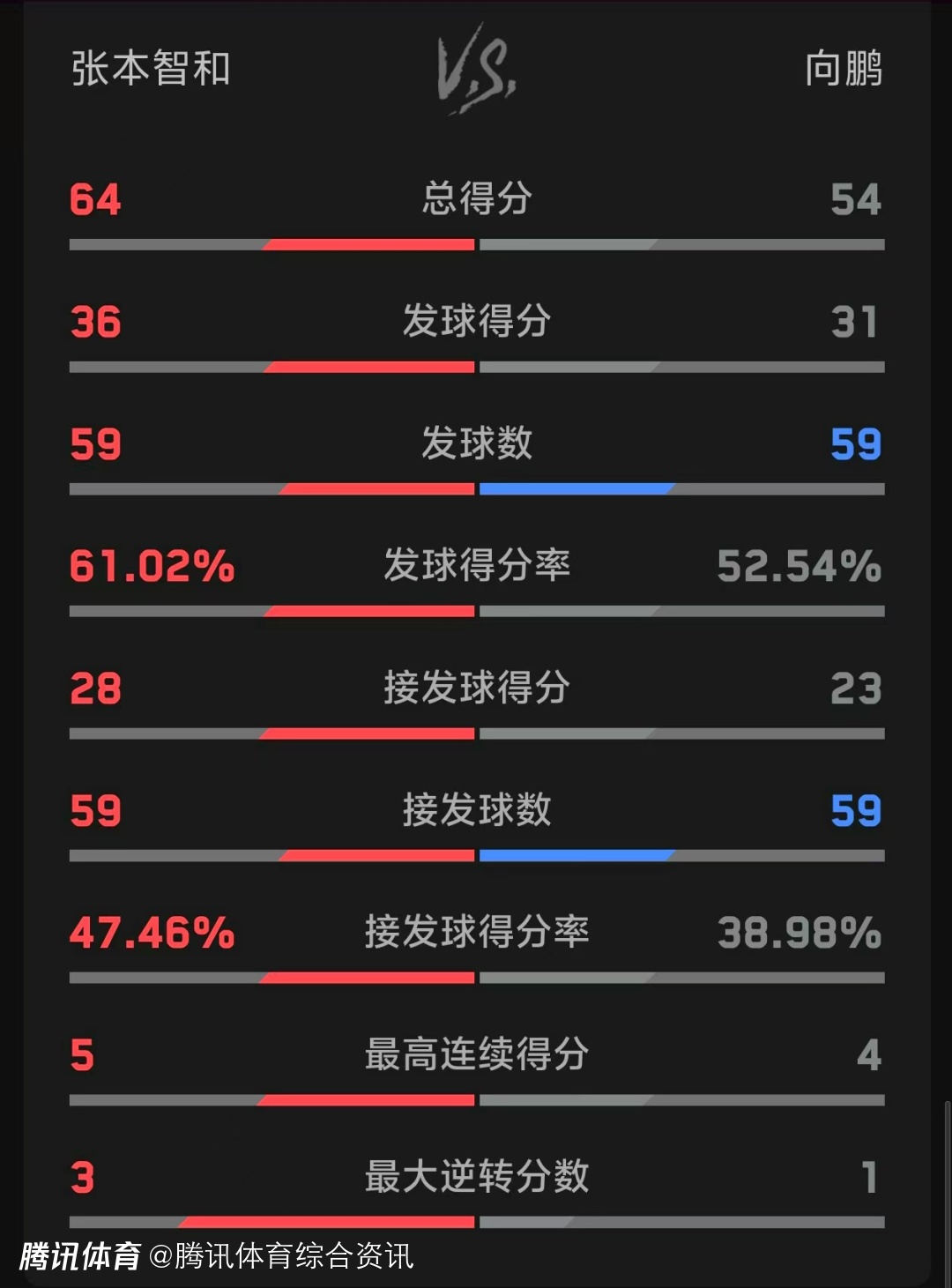 第五局张本智和以3-1开局,向鹏连拿3分反超。张本智和掀起反攻,连拿3分以6-4重夺领先。张本智和最终11-6拿下第五局,暂以3-2反超。