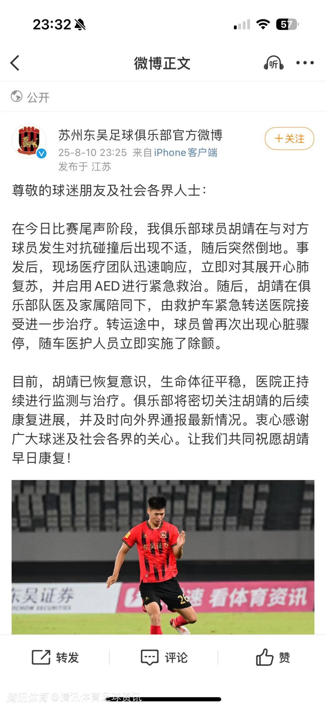 苏州东吴俱乐部官方发布声明,感谢医疗团队和球迷的关心,表示将持续关注胡靖的康复情况,并会及时公布最新动态。