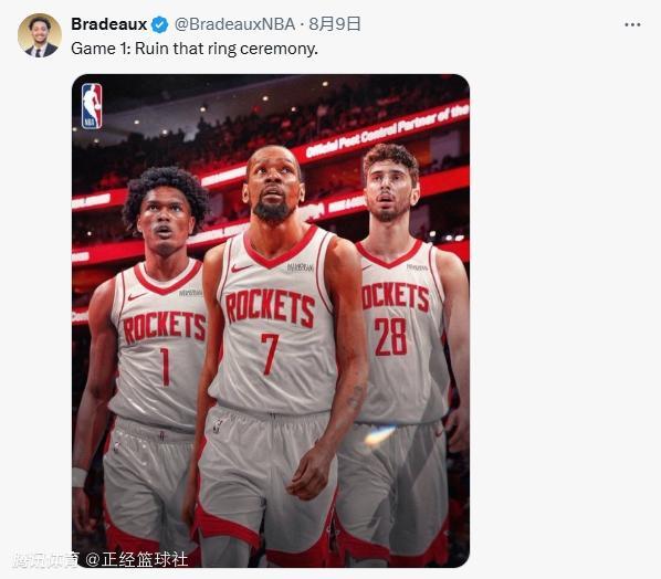 对于这种安排,火箭媒体人Bradeaux在社交媒体上晒出火箭三巨头,并配文:“揭幕战:毁了那个颁奖典礼。”