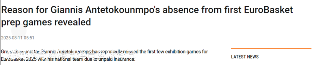 2025-08-11 15:00北京时间8月11日,随着许多NBA球星已在今夏代表各自国家队完成首秀,希腊超级巨星字母哥至今尚未在今夏代表国家队参加任何一场友谊赛。原因或许已经揭晓。据希腊媒体SDNA报道,字母哥缺席希腊队欧锦赛热身赛是由于保险费用未支付。