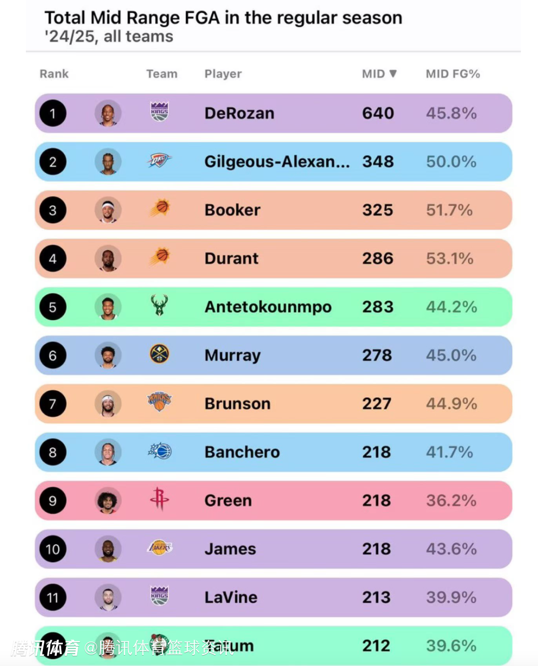 根据相关统计显示,字母哥在上赛季命中283记中距离,命中率44.2%,排名全联盟第5,命中数在他之前的分别是德罗赞(640记,命中率45.8%)、亚历山大(348记,命中率50%)、布克(325记,命中率51.7%)、杜兰特(286记,命中率53.1%)。