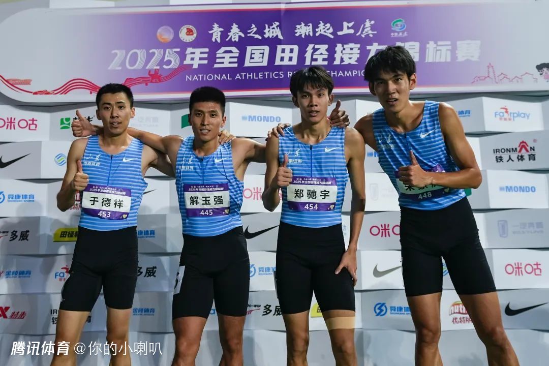 男子4x400米接力决赛中,山东队以3分03秒82的赛季最好成绩斩获冠军。亚季军队伍均刷新各自省纪录,江苏队跑出3分03秒94收获亚军,安徽队以3分04秒72获得季军。
