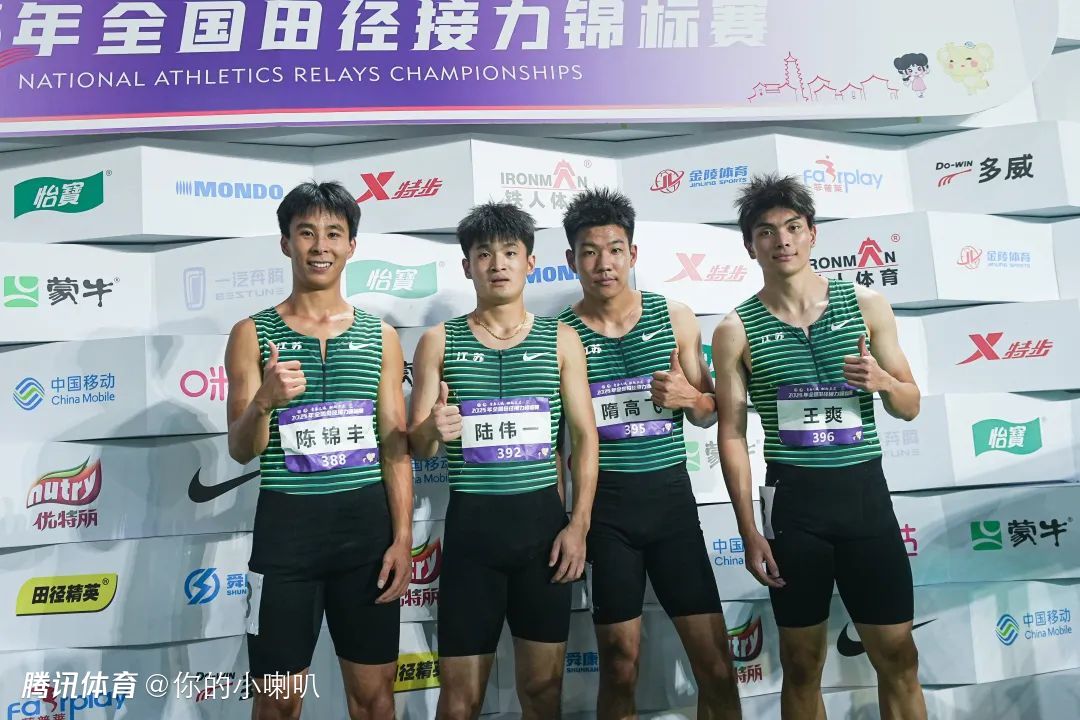男子4x100米接力决赛上,前三名队伍均跑进39秒并刷新各自省份纪录,江苏队以38秒33的成绩夺得冠军,江西队以38秒54收获亚军,上海队以38秒64获得季军。