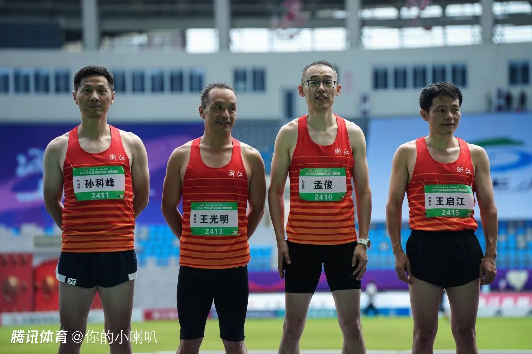 男子社会99+组 4x100米接力赛场上,浙江老将队包揽前三,浙江老将2队以48秒66斩获冠军,浙江老将1队以48秒83收获亚军,浙江老将3队以52秒42获得季军。
