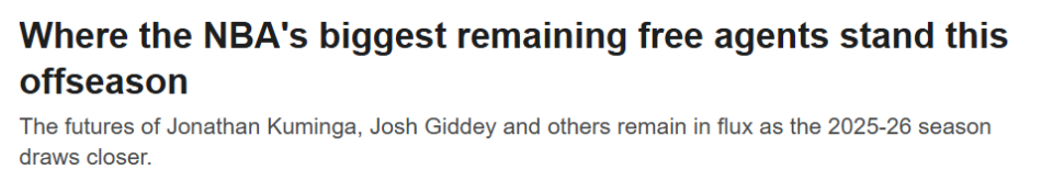 2025-08-12 05:40北京时间8月12日,随着2025-26赛季的日益临近,NBA大多数球队都在对阵容进行最后的调整。然而,仍有一些自由球员尚未确定下家——部分球员因合同问题陷入僵局,另一些则在纠结赛季开始时将为哪支球队效力。库明加、吉迪和威斯布鲁克等人都在等待敲定自己的未来。ESPN撰文解读了剩余七位最重要的自由球员,分析他们在谈判中的处境,以及有限的薪资空间如何影响联盟格局——