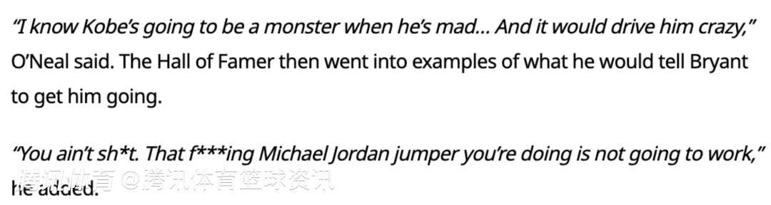 奥尼尔透露:“我知道科比生气的时候会变成一头猛兽,而这(垃圾话)会把他逼疯,所以有一次我特意刺激他‘你什么都不是,你模仿迈克尔-乔丹的跳投根本行不通。’”