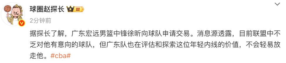 2025-08-12 15:20北京时间8月12日,根据篮球媒体人球圈赵探长发布的消息显示,广东宏远男篮中锋徐昕向球队申请交易。据消息源透露,目前联盟中不乏对他有意向的球队,但广东队也在评估和探索这位年轻内线的价值,不会轻易放走他。