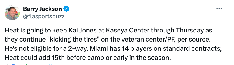 据悉,凯-琼斯没有资格签双向合同。迈阿密热火目前有14名标准合同球员,球队可以在训练营开营前或赛季初期签下第15人。