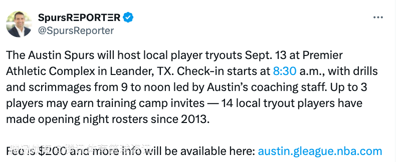 2025-08-13 01:00北京时间8月13日,据马刺队记Dusty Garza报道,马刺G联赛附属球队奥斯汀马刺将于9月14日在德州举办本地球员试训的训练营,报名费为每人200美金。