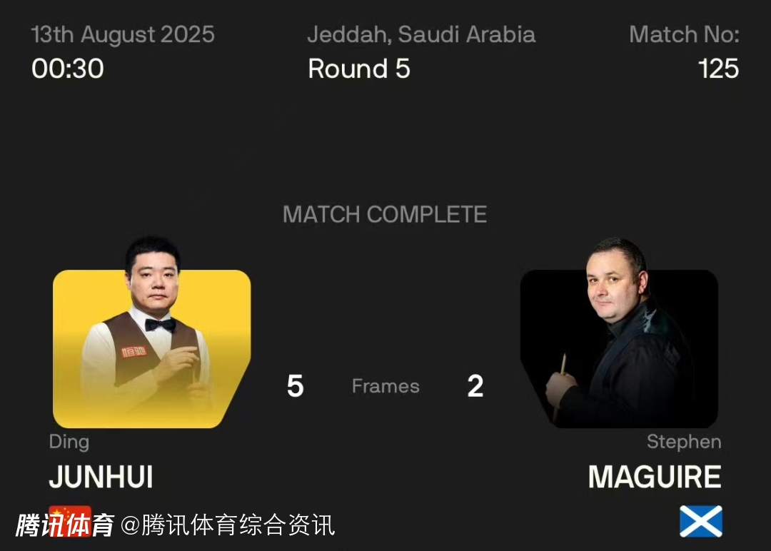 第六局,丁俊晖率先拿下40分后出现失误,马奎尔虽打进红球,但随后打丢蓝球,错失良机。丁俊晖抓住对手失误再次上手,单杆打出50分,以90-1拿下该局,4-2领先马奎尔,率先拿到赛点。第七局,丁俊晖延续良好状态,单杆轰出62分,以68-0锁定胜局,最终以5-2的比分击败马奎尔,成功挺进16强。