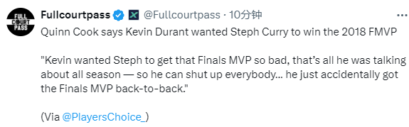 2025-08-13 07:10北京时间8月13日,前勇士球员奎因-库克在节目访谈中表示,在2018年总决赛比赛中,杜兰特希望库里赢得2018年总决赛FMVP。