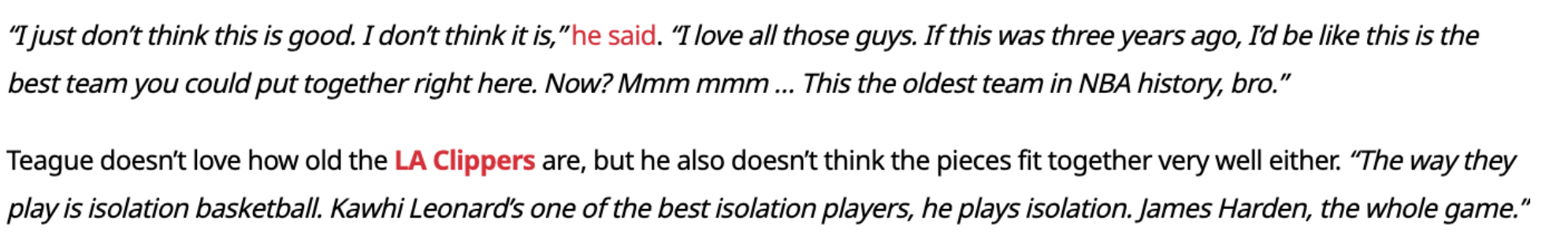 蒂格明确表示自己不看好这支快船,他说道:“我爱那些家伙们。要是三年前,我会觉得这是能组建出的最佳球队。可现在?这是NBA历史上最老的球队了。另外他们是支(依靠球星)单打球队。小卡是单打能力最强的球员之一,他在单打,而哈登整场比赛也都在单打。”